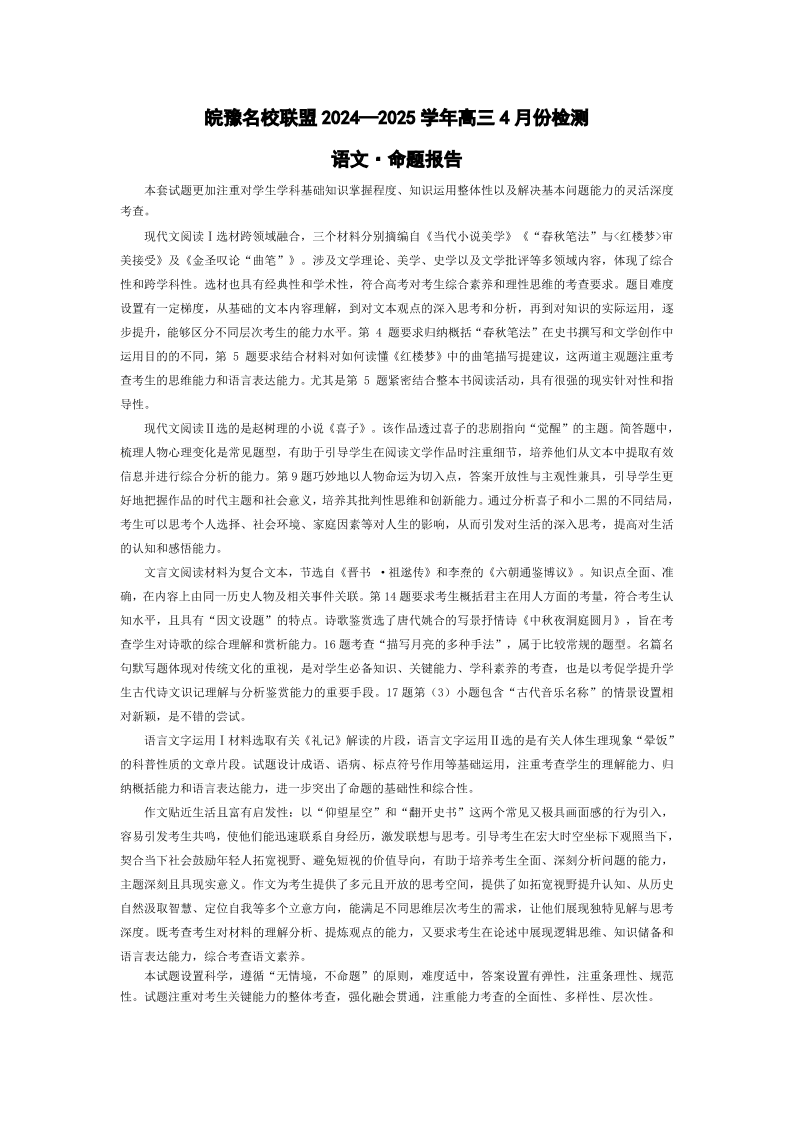 安徽省皖豫名校联盟2024-2025学年下学期4月高三检测语文命题报告