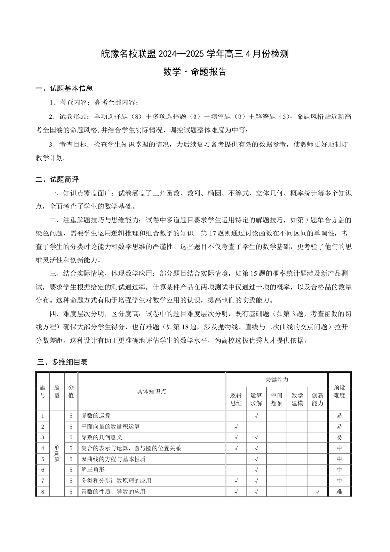 安徽省皖豫名校联盟2024-2025学年下学期4月高三检测数学命题报告