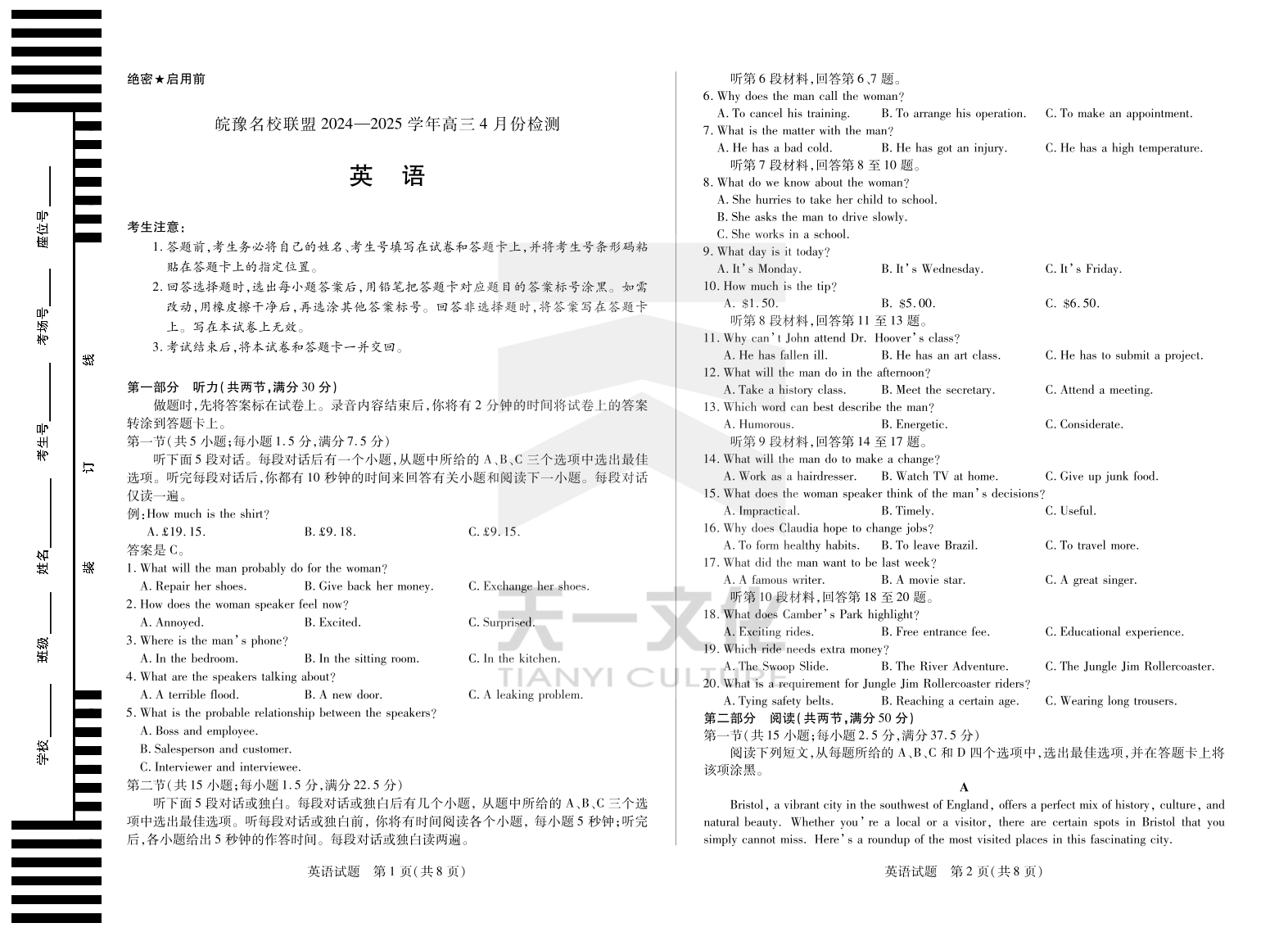 安徽省皖豫名校联盟2024-2025学年下学期4月高三检测英语