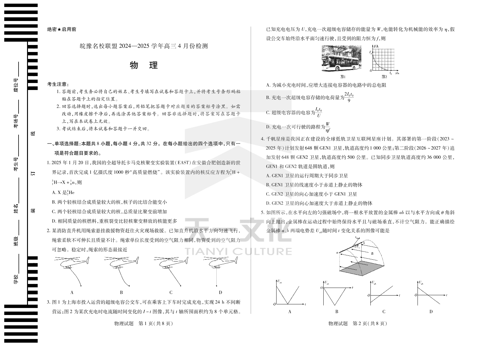 安徽省皖豫名校联盟2024-2025学年下学期4月高三检测物理