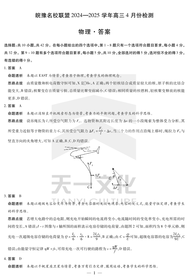 安徽省皖豫名校联盟2024-2025学年下学期4月高三检测物理答案