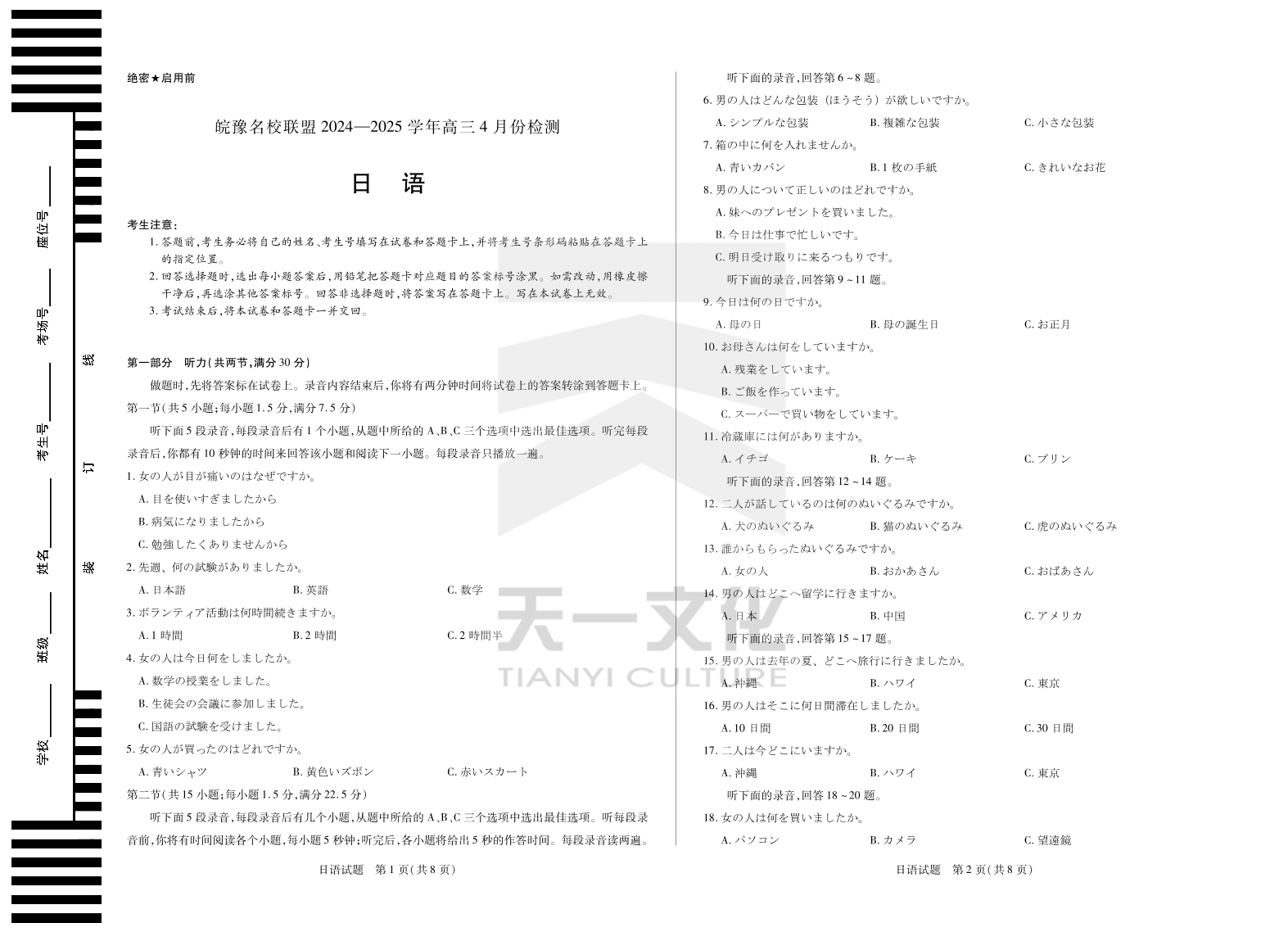 安徽省皖豫名校联盟2024-2025学年下学期4月高三检测日语