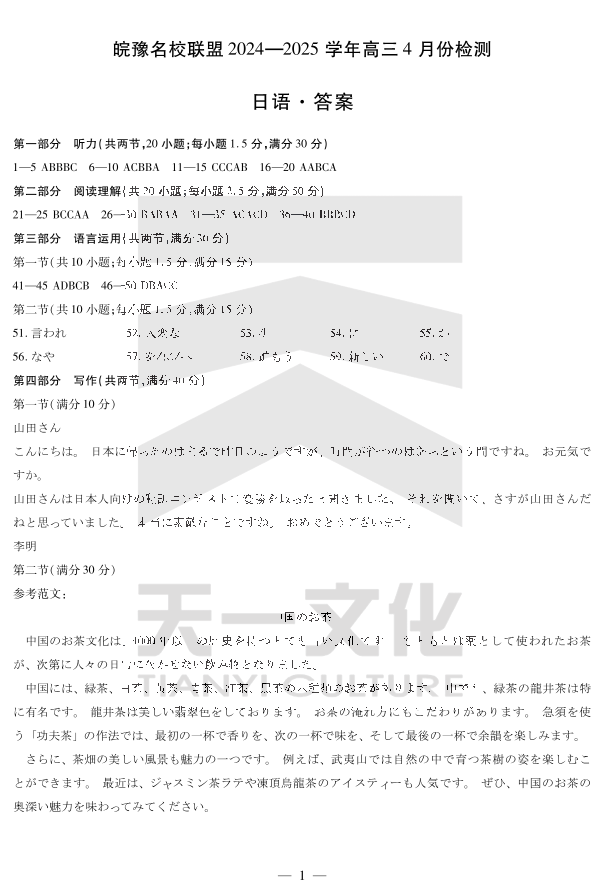 安徽省皖豫名校联盟2024-2025学年下学期4月高三检测日语答案