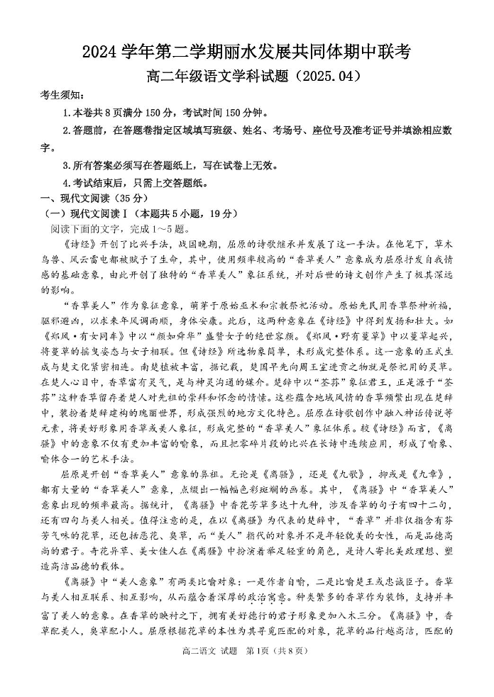 浙江省丽水市发展共同体2024-2025学年下学期4月高二期中联考语文+答案