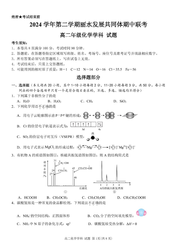 浙江省丽水市发展共同体2024-2025学年下学期4月高二期中联考化学+答案