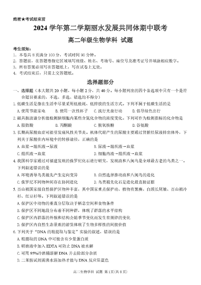 浙江省丽水市发展共同体2024-2025学年下学期4月高二期中联考生物+答案