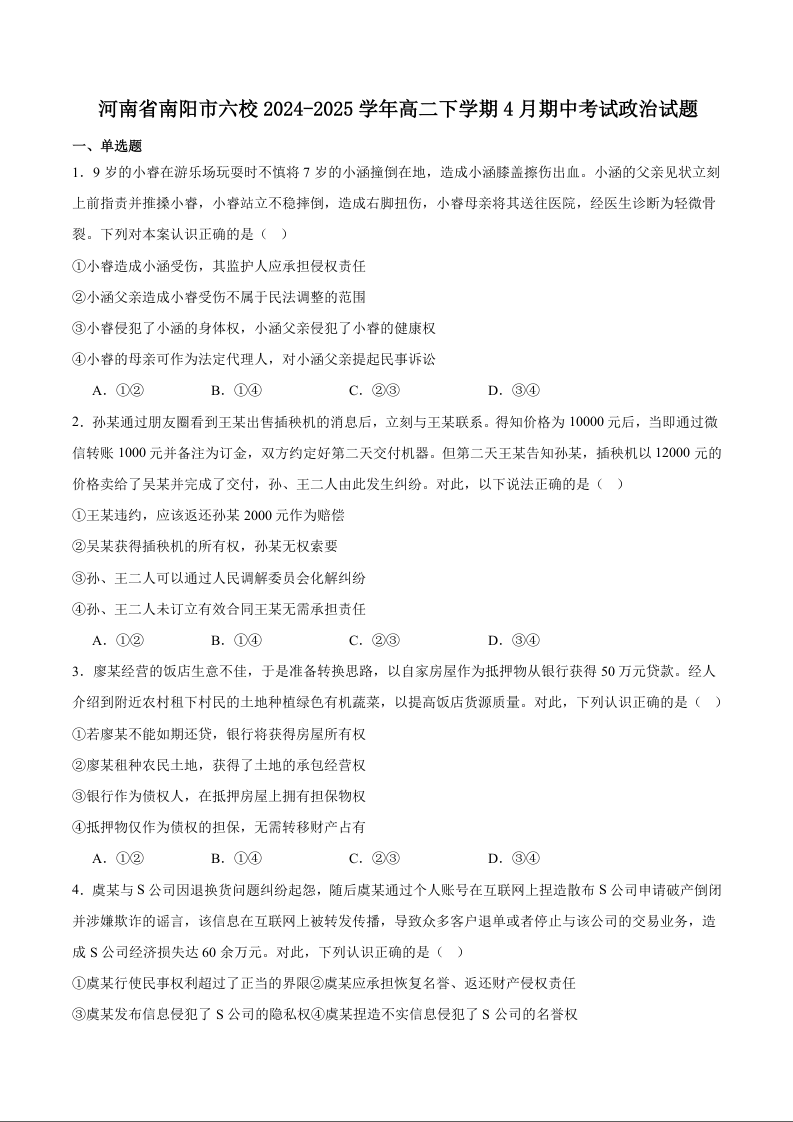 河南省南阳市六校2024-2025学年下学期高二期中考试政治+答案