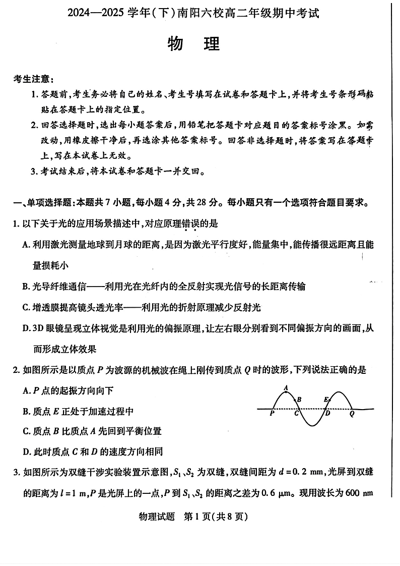 河南省南阳市六校2024-2025学年下学期高二期中考试物理+答案