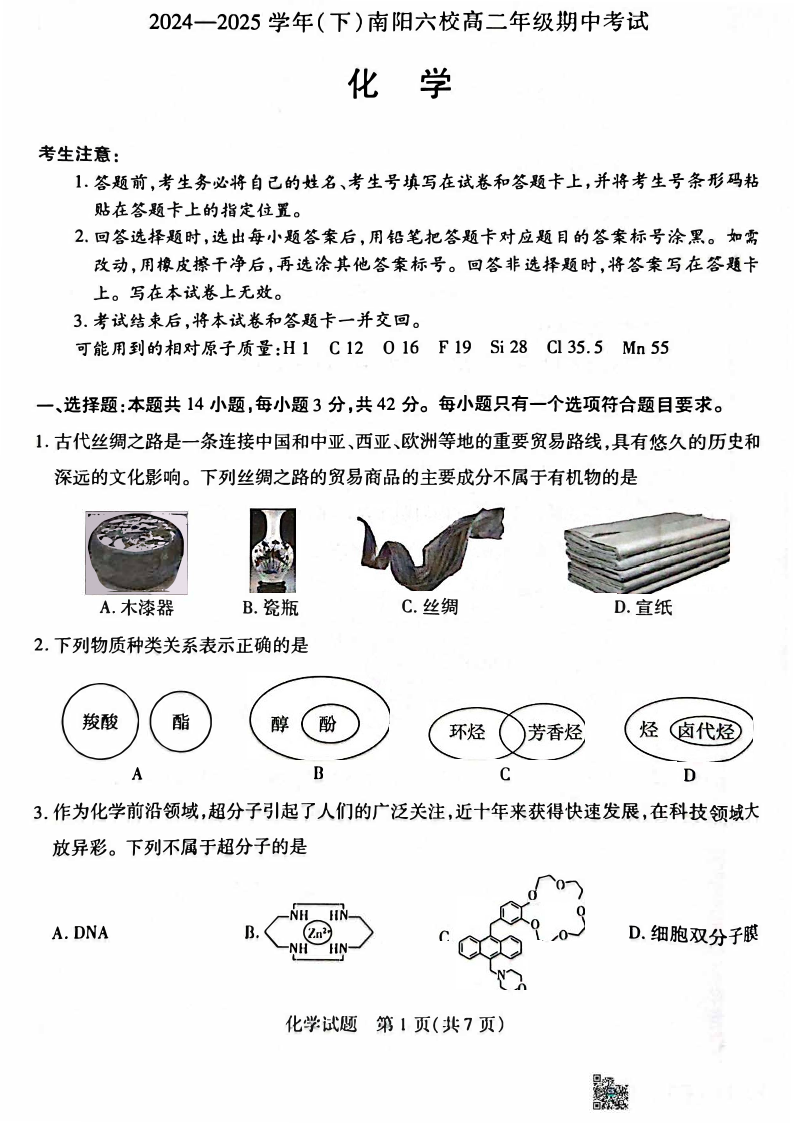 河南省南阳市六校2024-2025学年下学期高二期中考试化学