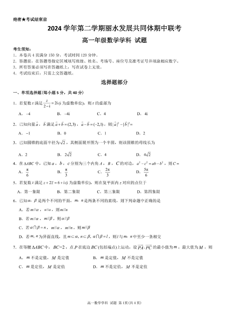浙江省丽水市发展共同体2024-2025学年下学期4月高一期中联考数学+答案