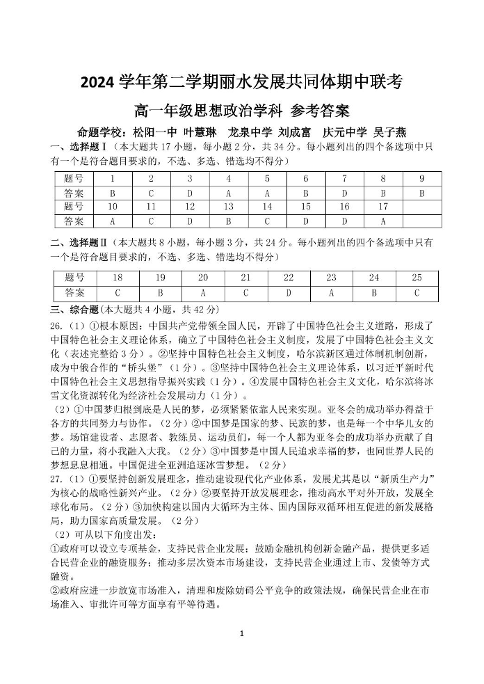 浙江省丽水市发展共同体2024-2025学年下学期4月高一期中联考政治答案