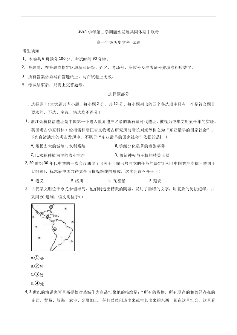 浙江省丽水市发展共同体2024-2025学年下学期4月高一期中联考历史+答案