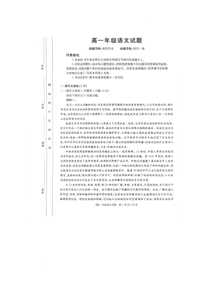 河南省南阳市六校2024-2025学年下学期高一期中考试语文+答案