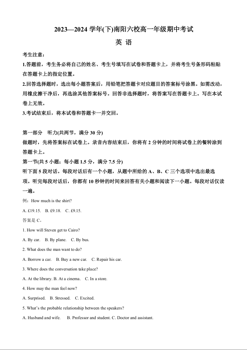 河南省南阳市六校2024-2025学年下学期高一期中考试英语