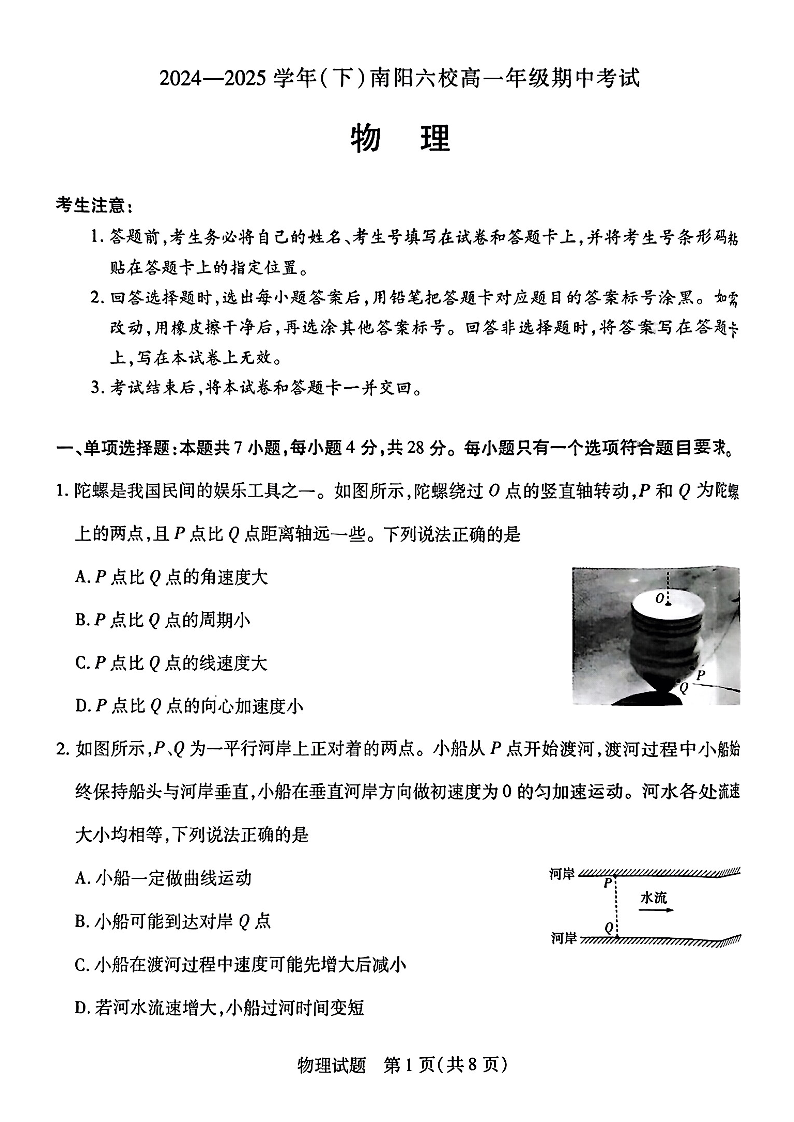 河南省南阳市六校2024-2025学年下学期高一期中考试物理+答案
