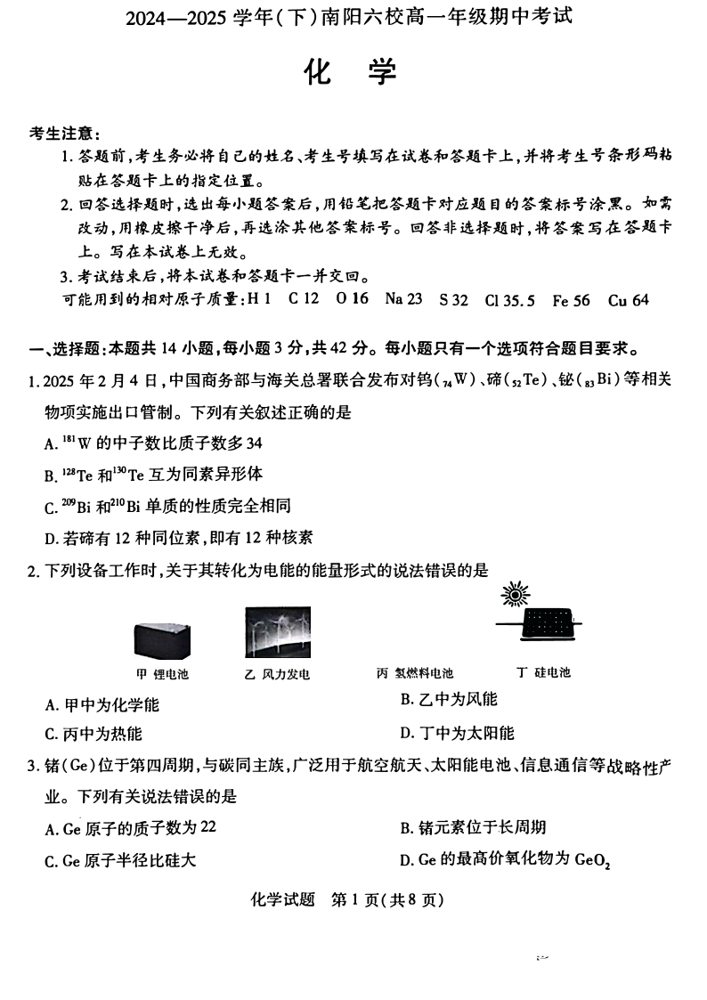 河南省南阳市六校2024-2025学年下学期高一期中考试化学