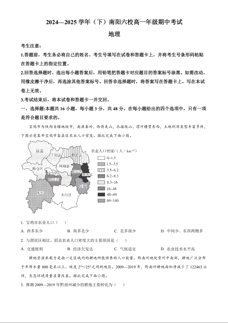 河南省南阳市六校2024-2025学年下学期高一期中考试地理+答案