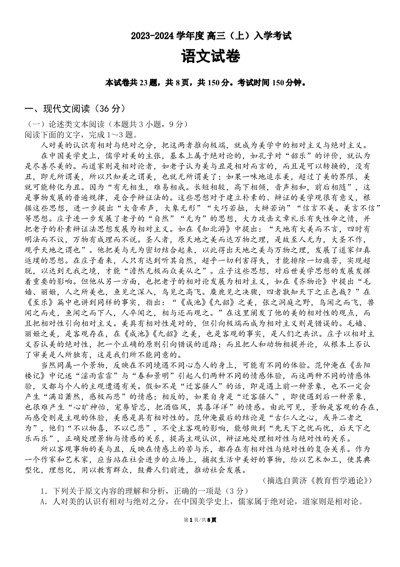 四川省成都市第七中学2024届高三上学期入学考试语文