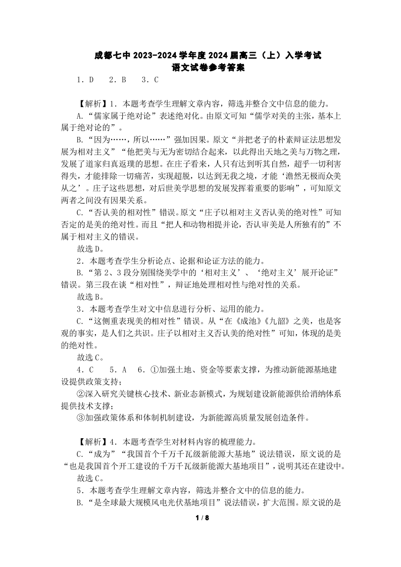 四川省成都市第七中学2024届高三上学期入学考试语文答案