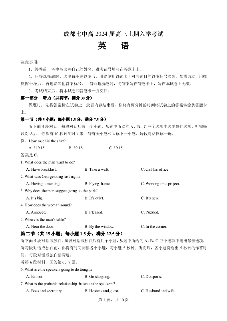 四川省成都市第七中学2024届高三上学期入学考试英语