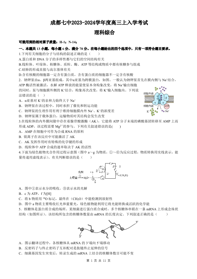 四川省成都市第七中学2024届高三上学期入学考试理综