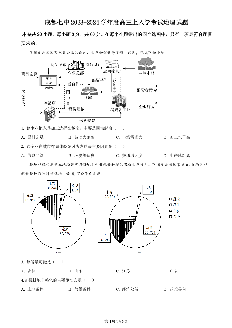 四川省成都市第七中学2024届高三上学期入学考试地理(原卷版)