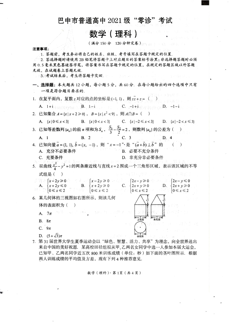 四川省巴中市2024届普通高中高三上学期“零诊”考试理科数学