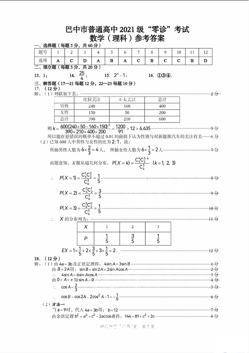 四川省巴中市2024届普通高中高三上学期“零诊”考试理科数学答案