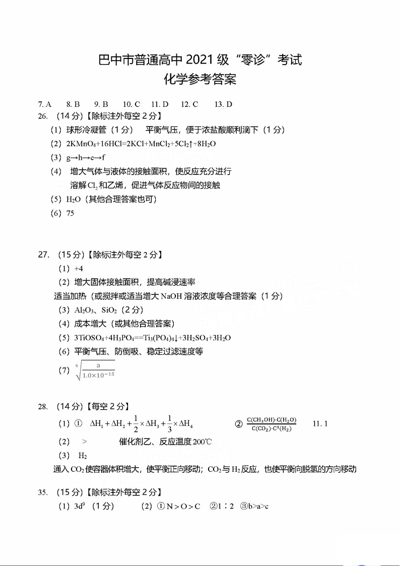 四川省巴中市2024届普通高中高三上学期“零诊”考试化学答案