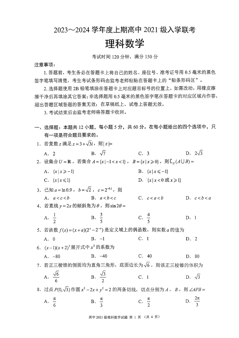 四川省成都市蓉城联盟2024届高三上学期开学考试理科数学