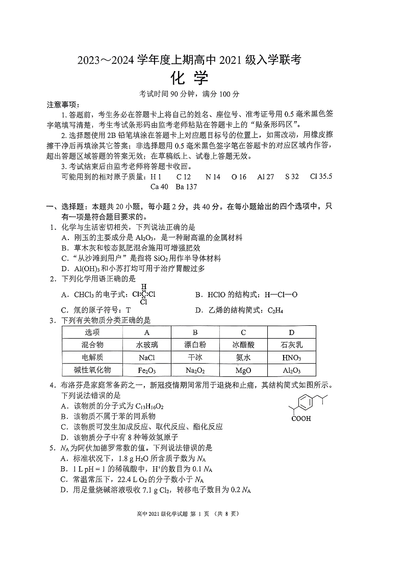 四川省成都市蓉城联盟2024届高三上学期开学考试化学