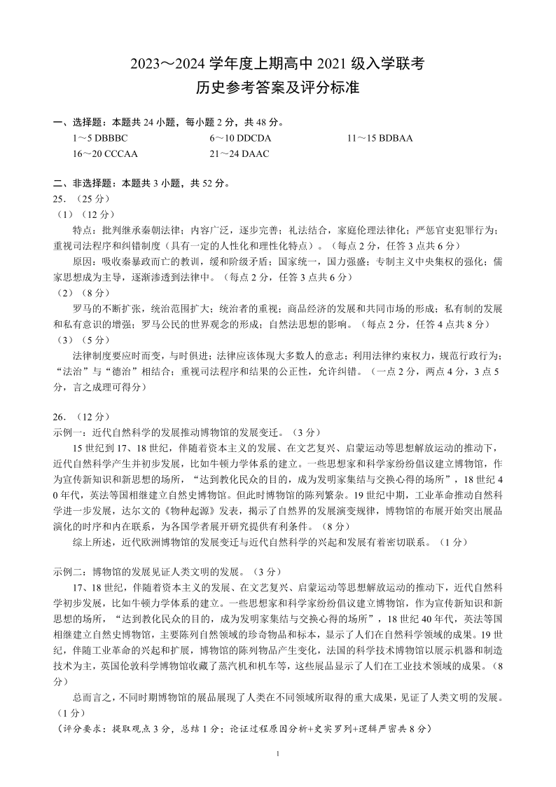 四川省成都市蓉城联盟2024届高三上学期开学考试历史答案