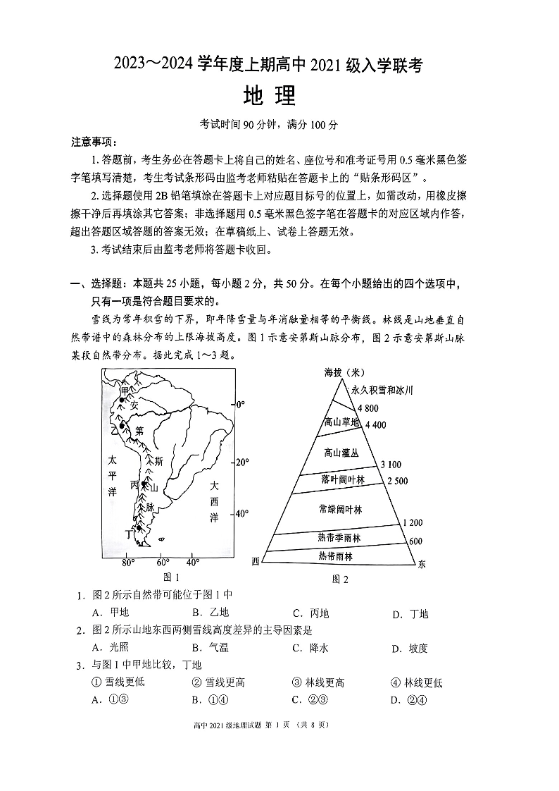 四川省成都市蓉城联盟2024届高三上学期开学考试地理