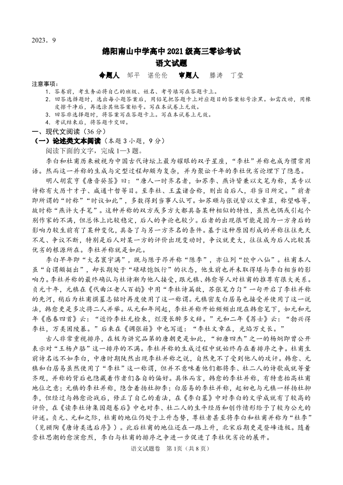 四川省绵阳南山中学2024届高三上学期零诊考试(9月)语文