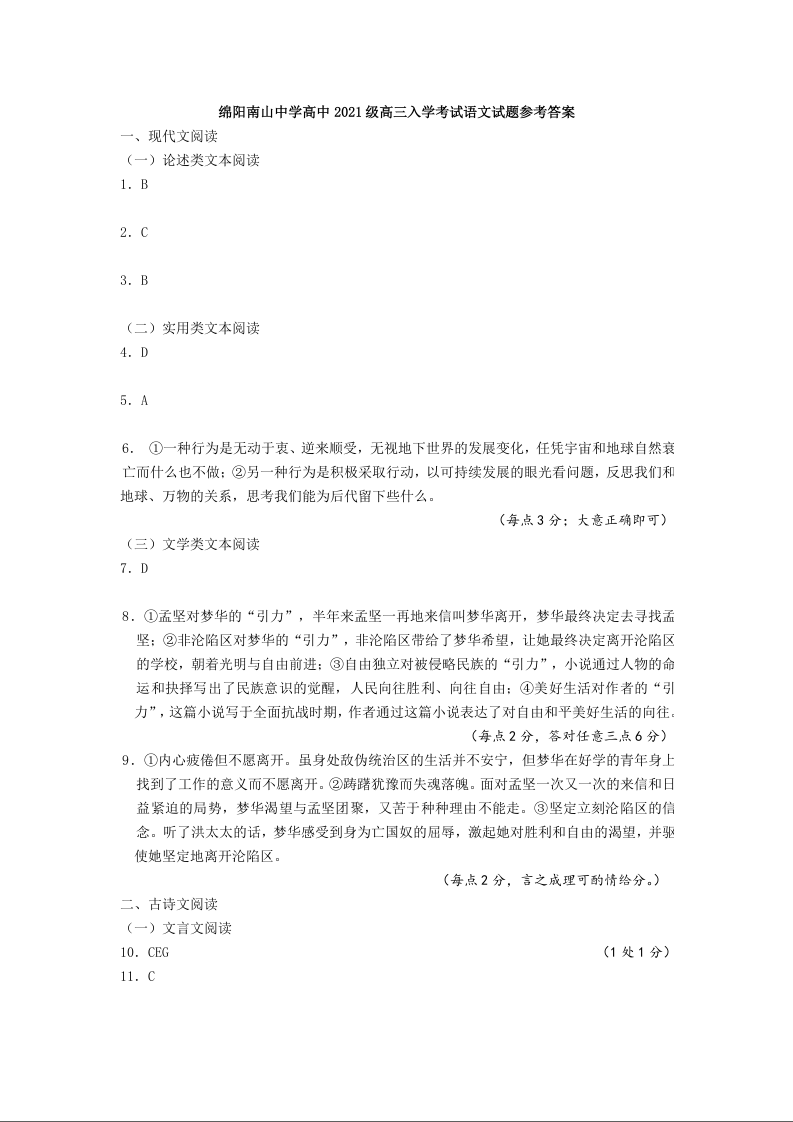 四川省绵阳南山中学2024届高三上学期零诊考试(9月)语文答案