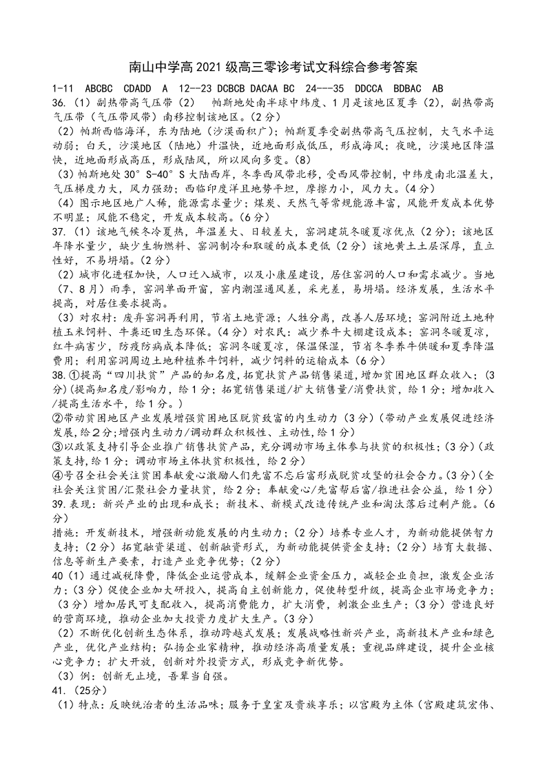 四川省绵阳南山中学2024届高三上学期零诊考试(9月)文综答案