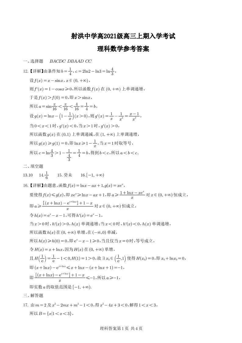 四川省射洪中学2024届高三上学期开学考试理科数学答案