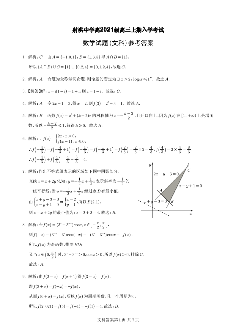 四川省射洪中学2024届高三上学期开学考试文科数学答案