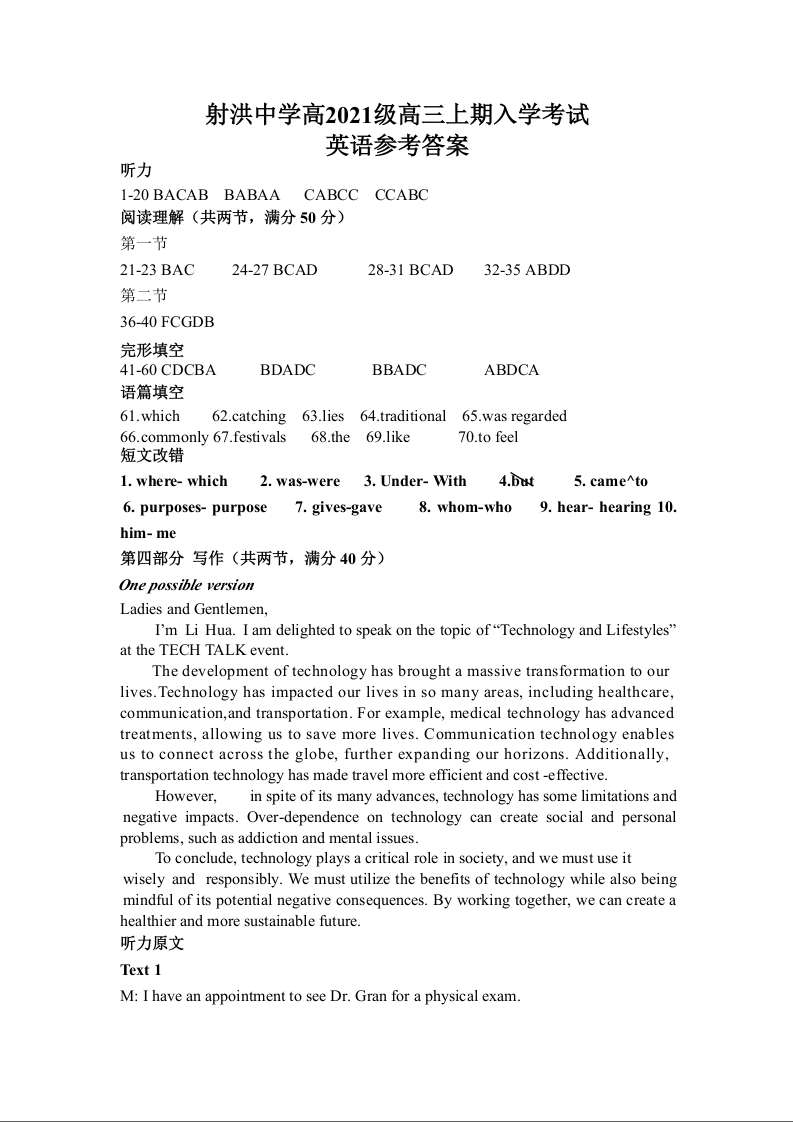 四川省射洪中学2024届高三上学期开学考试英语答案