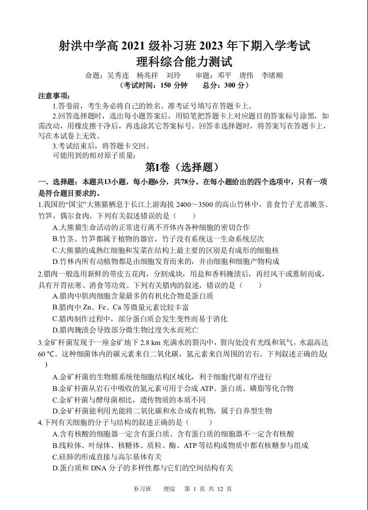 四川省射洪中学2024届高三上学期开学考试理综(补习班)