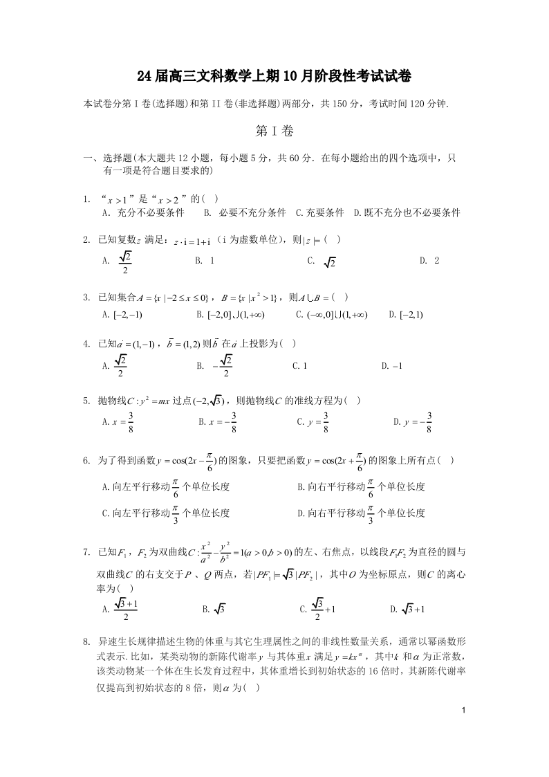 四川省成都市第七中学2024届高三上学期10月月考文科数学+答案