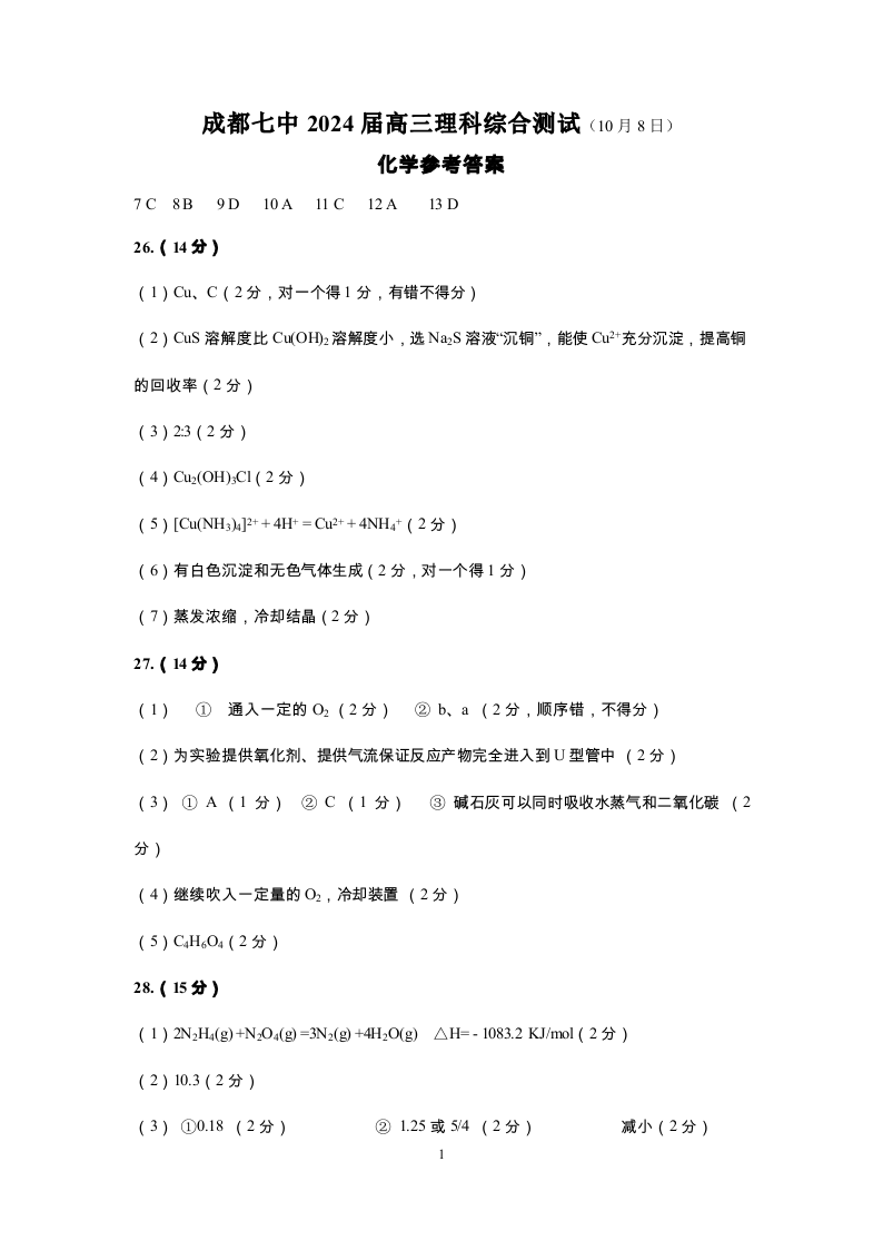 四川省成都市第七中学2024届高三上学期10月月考理综答案