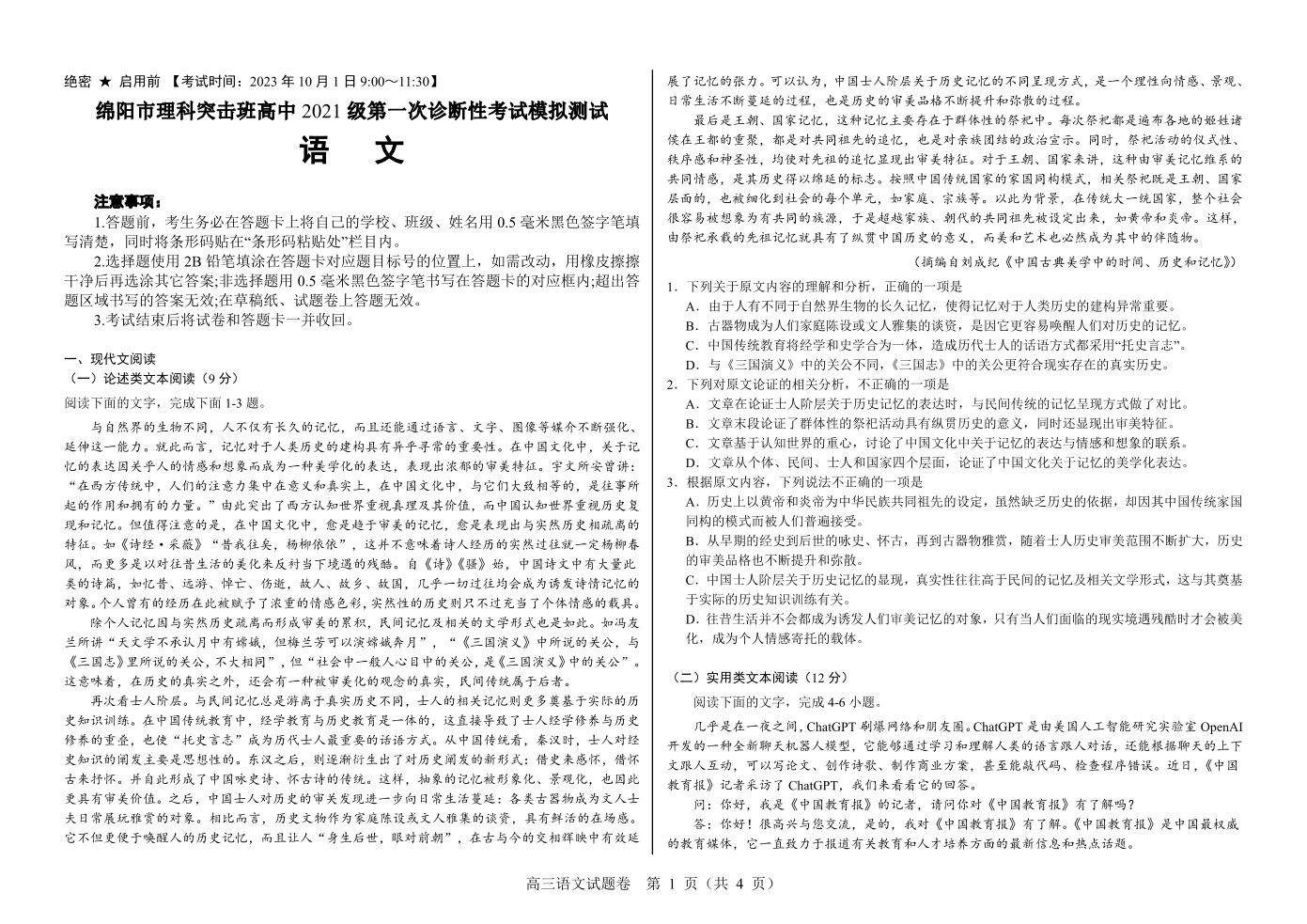四川省绵阳高中2024届高三理科突击班第一次诊断性考试模拟测试语文