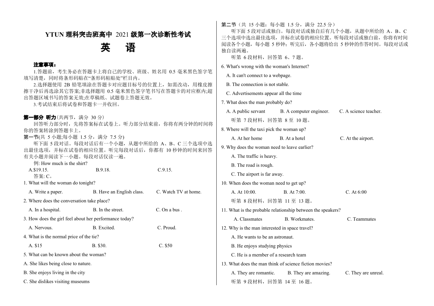 四川省绵阳高中2024届高三理科突击班第一次诊断性考试模拟测试英语