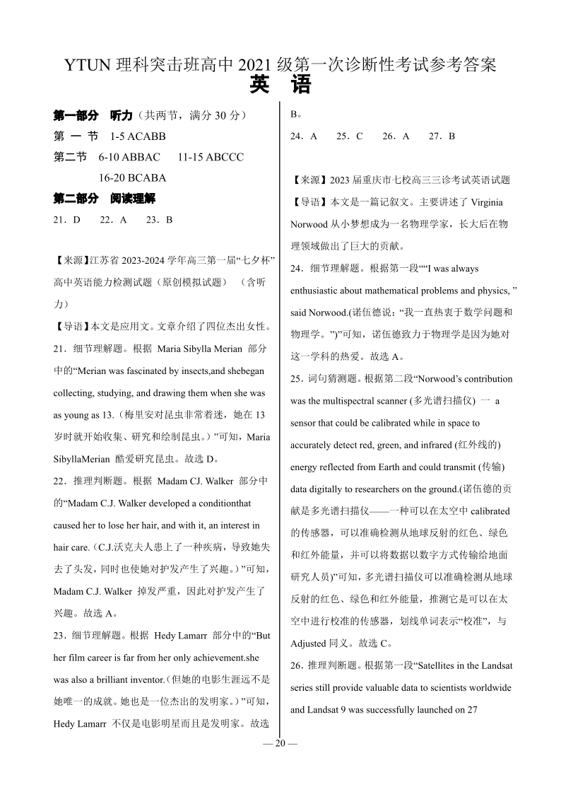 四川省绵阳高中2024届高三理科突击班第一次诊断性考试模拟测试英语答案