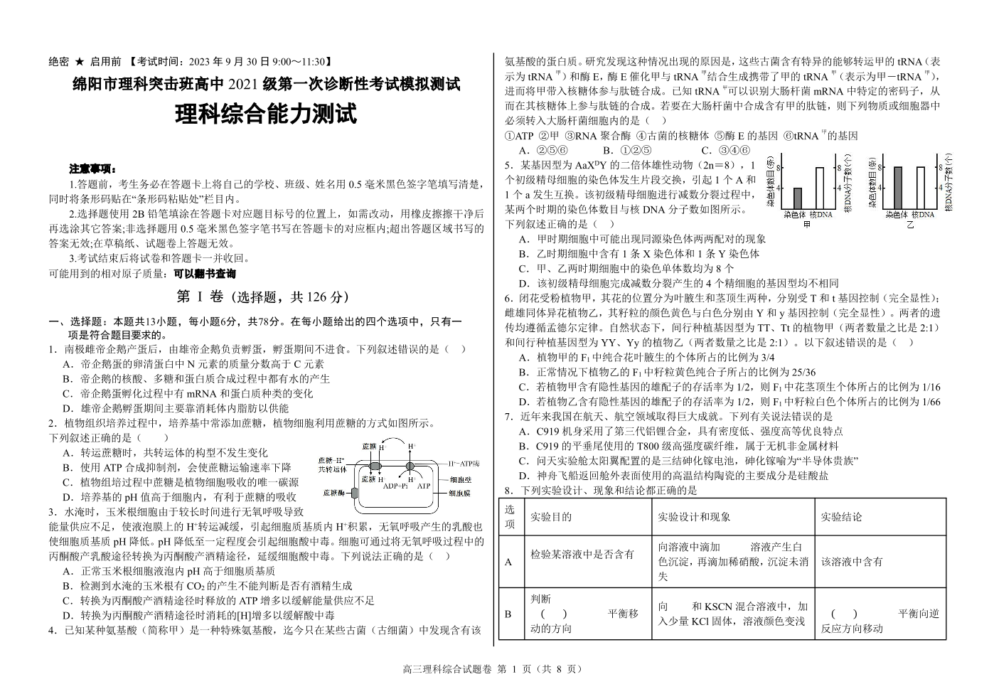 四川省绵阳高中2024届高三理科突击班第一次诊断性考试模拟测试理综