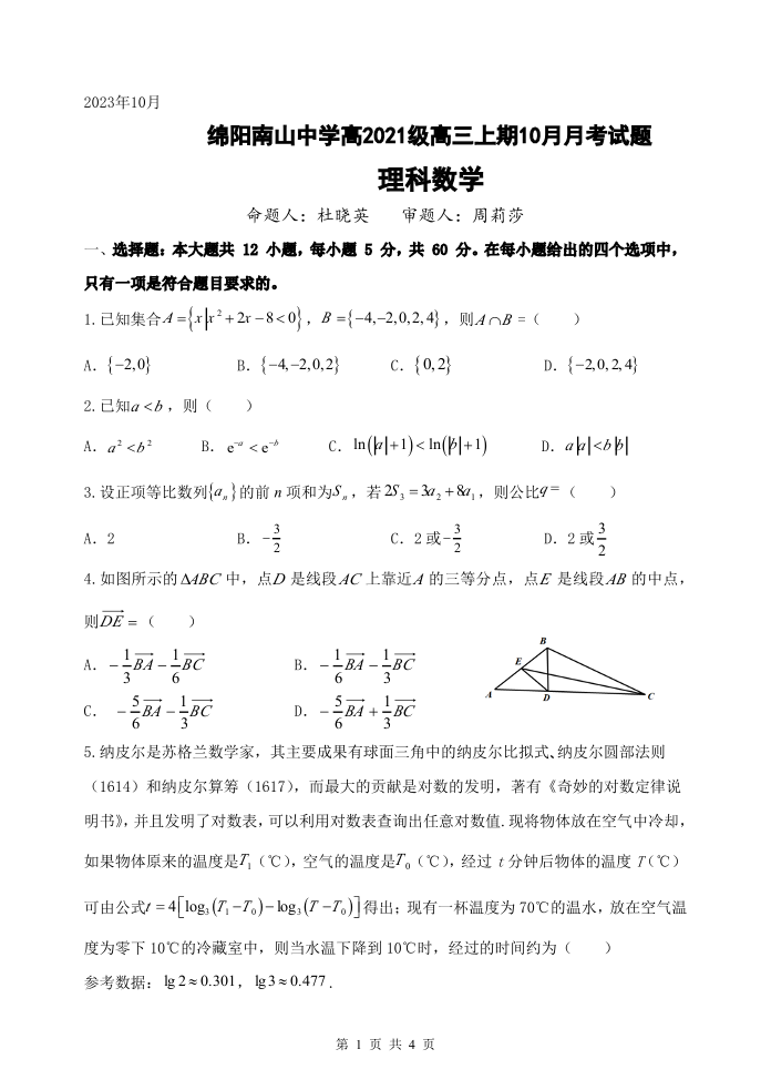 四川省绵阳南山中学2024届高三上学期10月月考理科数学