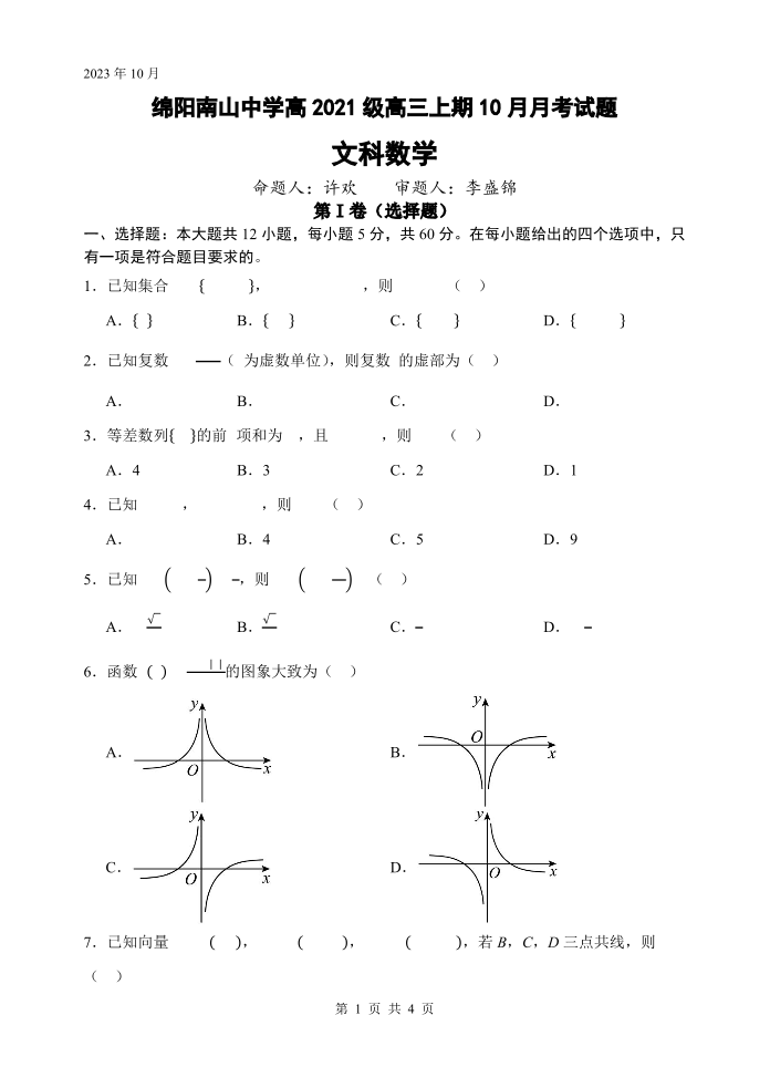四川省绵阳南山中学2024届高三上学期10月月考文科数学