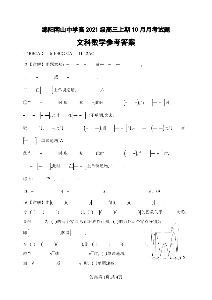 四川省绵阳南山中学2024届高三上学期10月月考文科数学答案