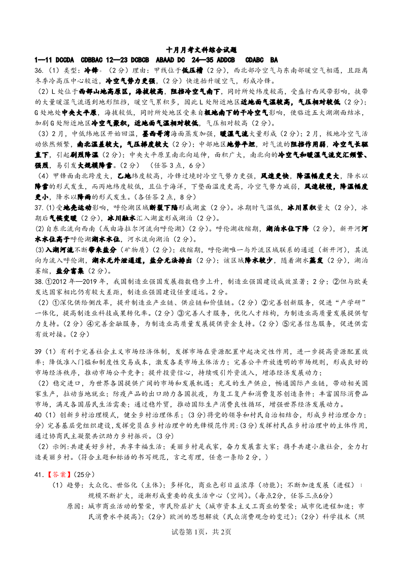 四川省绵阳南山中学2024届高三上学期10月月考文综答案